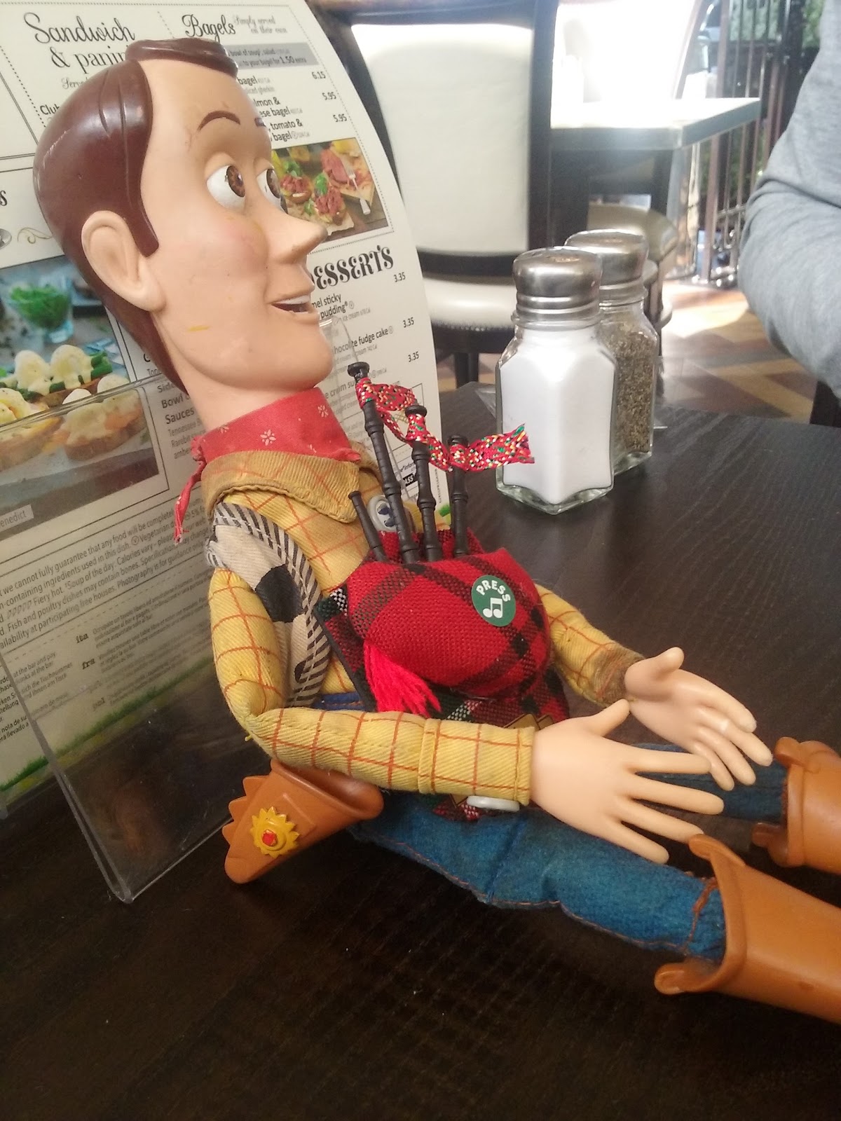 at the airport we bought Woody his own little set of bagpipes, which actually play Auld Lang Syne